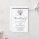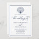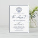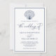 This simple minimal beach wedding invitation design has a scallop shell at the top, elegant script calligraphy, and a frame around the edge, with white background and navy blue text.