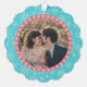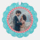 Celebrate your beach-themed wedding or simply enjoy family Christmas memories in a tropical locale with these beautiful paper ornaments. The design includes a retro-style snowflake pattern in white on an aquamarine background, along with two of your personalized photos inside a frame of coral pink. Use the easy templates to add your custom photos. Design tip: You can also use the design tool to change the aquamarine colour of the background or the coral colour of the photo circle!