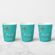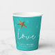 Whimsical modern beach wedding paper cup in blue teal with white love script and your names. Perfect choice for a modern beach, sea, oceanfront, coastal, tropical, nautical, or destination theme wedding.