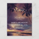 Beach or destination wedding save the date postcards with palms, purple sunset and string lights