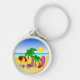 At The Beach © Sunny Mars Designs. This cute colourful premium round keyring or keychain features a fun vector illustration of a beach scene with beach items including a beach umbrella, a beach ball, flip flops, a bucket and spade, palm trees, a beach towel and a surfboard.