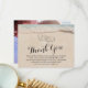 Wedding thank you note on a flat invitation card is a simple way to thank those who attended your wedding day. The card features a summer tropical beach island background, a vintage sandy beach with two hearts in the shoreline, your initials, a thank you note. On the reverse is a photo of a happy couple to be changed to your own.