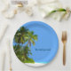 Summer beach party plates with scenic image of a coastal palm trees and beach sand along with tropical ocean in the background with text you can customize and personalize.  A natural design with the ocean and tropical foliage designed as a beach theme paper plate you can use to entertain and serve your party guests.