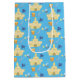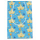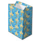 This beach themed design features a tan sandcastle, orange pail and grey shovel, blue sailboat, octopus, fish, and a yellow starfish in a repeating pattern.