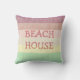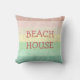Beach theme home decor throw pillow with beautiful tropical beach colours in shades of blues, greens, mauve and earth tones on both sides in a colourful design including the words Beach House you can personalize if you want to. Designed as a home decor accessory to bring some colour and character to your home living room, family room, or den in a decorative way.