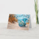Season's Greetings in a beach theme for the lover of the coastal ranges featuring a blue seashell with a matching Santa hat, a string of turquoise blue holiday lights and writing in the sand of Seas & Greetings for a fun play on words.
