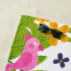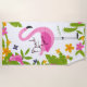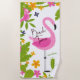 Here's a bright and colourful beach towel that declares it is "Beach Time" and has your name on it, too. The central image is a large pink flamingo. The flamingo is framed with tropical leaves, flowers, a pink parrot, and even a cactus. Colours used include green, gold, and pink. Everything is placed on a white background.