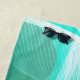 This beach towel is shown in a abstract art print of flowing lines in colours of seagreen and white.