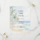 A watercolored sandy beach, ocean waves and palm trees as background. Personalize and add a date and your names.
