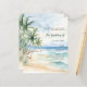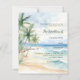 An elegant wedding invitation for a beach wedding, destination wedding. A watercolored sandy beach, ocean waves and palm trees as background.