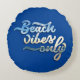 This round pillow features "Beach vibes only" typography on a dark blue background.