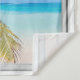 Beach and blue tropical seas, fake window scene, for a windowless bathroom or office wall. Fun, realistic optical illusion scenic tapestry for an office or study wall.