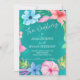 Whimsical modern beach wedding invitation with pink and blue teal tropical Hawaiian flowers on a water turquoise background with fancy white typography script. Perfect choice for a modern beach, sea, oceanfront, coastal, tropical, nautical or destination themed wedding.
