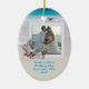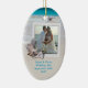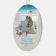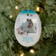 Keepsake wedding ornament with a beach theme. Add a picture to this oval, ceramic ornament and customize with text on both sides. Tropical seashells decorate the frame and background image is ocean water and beach sand. Place names, wedding date on the front and destination location on the back.