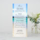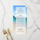 2 sided Wedding menu template for Beach Wedding. First side shows appetizers, salad, main course and dessert against a dramatic blue ocean with sandy beach. White puffy clouds in the background with beautiful shade of blue sky. Back side has same beautiful photo of a perfect beach. Can be customized any way you like with the fields, font selection and font colour. Perfect for the bride and groom beach destination wedding reception or other special event.