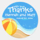 Fanciful design shows a beach ball sitting on the sand with blue water beyond. The white text looks great against the blue ocean water. It reads with love and thanks, the wedding couple's names and then their wedding date. Easy to customize. Great for a beach wedding, summer wedding, destination wedding.