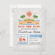 Modern retro typography beach wedding save the date postcard with palms, beach umbrellas, starfish couples, sea waves, sun and coral love hearts. Perfect beach scene postcard for tropical wedding save the date.