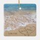 Frothy ocean water on tropiucal beach sand with hearts and newlywed names.