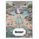 A pastel-hued chibi girl with a playful bob of purple hair and bright blue eyes is on the sandy shore, engrossed in the miniature world of rock pools. Sunlight filters through the clear water, illuminating the hidden treasures within. The tide has receded, leaving behind an array of fascinating creatures, each one a wonder to behold. Did you know that some species of sea anemones can live for over a century?