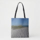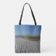 A lone beached kayak on a beach printed on an all-over printed tote bag