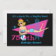 Fun retro 75th birthday invitations featuring a big blue and pink beach ball and beach babe wearing sunglasses, a blue polka dotted bikini and a pink tiara. Customizable text. Perfect for your favourite beach babe on this special birthday. PinkInkArt original!