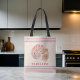 Beautiful quality tote bag in a heavy coated canvas. Shoulder strap is perfect length. Graphics are absolutely beautiful. The printing was great. The pink and black were perfect but the green didn't print as rich in color.