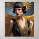 This image is a dazzling representation of the roaring 1920s flapper style, showcasing a woman adorned in the luxurious fashion of the era. She wears a black beaded dress with intricate gold embroidery that exemplifies the opulence of the time. Complementing her attire is an array of gold jewellery; layered necklaces with beads and pendants cascade elegantly down her neckline, and her ears are graced with matching chandelier earrings. Her dark hair is styled in a classic bob with waves and is crowned with a headpiece featuring golden leaves and feathers, further accentuating her glamourous look. Her makeup is bold and sophisticated, with sharp, winged eyeliner and striking red lipstick enhancing her striking features. The woman's pose and the richness of her attire convey a sense of luxury, confidence, and the iconic style of the Jazz Age.