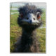 Full colour photographic image of an EMU, or large ostrich-like bird, with details showing feathers and plumage, and its beady brown eyes intently focused on its prey - the photographer!