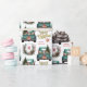A teal blue pickup truck carries a decorated Holiday tree and gift packages on this cute gift wrapping paper. An adorable Beagle dog wears a Santa Claus hat and looks out from the tailgate. A rustic wooden sign on the back bumper says "Christmas Cheer". Your monogram is enclosed within a pretty pine cone and red berry wreath, and stylized gold text says "Merry Christmas". You may also customize the "from the (Name) section.