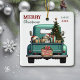A teal blue retro pickup truck carries a decorated Holiday tree and gift packages on this cute ceramic Christmas ornament. Looking out from the tailgate is a beautiful Beagle Hound dog. A rustic wooden sign on the back bumper says "Christmas Cheer". The red and green stylized text at the top left says "MERRY CHRISTMAS", with your name (or your dog's) and the year at the right. Both sides have the same image.