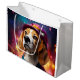 A playful Beagle dressed in a vibrant, whimsical costume against a glowing, magical backdrop. This enchanting design is perfect for animal lovers.