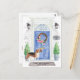 Announce your new address with our stylish announcement featuring a Beagle, blue front door, welcome mat, slate sign, topiaries and a floral wreath set on a grey brick background.