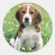 Adorable Beagle puppy is sitting in a field of green grass and clover. More wonderful Beagle dog gifts with this image in my store.