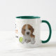 "Beagle puppy kisses fix everything" declares this mug for the Beagle Dog owner. The image on each side is a portrait of an adorable brown and white Beagle puppy. The images and text are placed on a white background that is sprinkled with gold confetti.