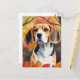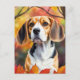 Artwork of cute beagle portrait in autumn forest background with fall leaves. The hound is facing forward, looking off to the side. A warm colour scheme with browns, reds, oranges.
