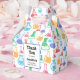 Tiny favour box with a fun and colourful pattern. Research scientist vibe with beakers and flasks of different shapes and sizes in bright happy colours.