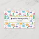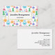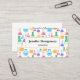 Business cards with a fun and colourful pattern. Research scientist vibe with beakers and flasks of different shapes and sizes in bright happy colours.