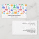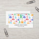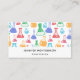 Business cards with a fun and colourful pattern. Research scientist vibe with beakers and flasks of different shapes and sizes in bright happy colours.