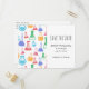 Save the date postcard with a fun and colourful pattern. Research scientist vibe with beakers and flasks of different shapes and sizes in bright happy colours.