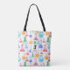Tote bag with a fun and colourful pattern. Research scientist vibe with beakers and flasks of different shapes and sizes in bright happy colours.
