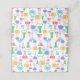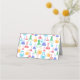 Folded place cards with a fun and colourful pattern. Research scientist vibe with beakers and flasks of different shapes and sizes in bright happy colours.