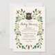 Woodland themed baby shower design by Shelby Allison featuring an illustration of whimsical green floral designs surrounding a sweet bear cub portrait.