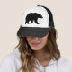 Grizzly (Brown) bear walking, black silhouette on black and white hat. Original art by M Chaume. Have a happy day!