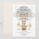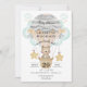 A whimsical watercolor teddy bear with hot air balloon baby shower in a gender neutral brown and blue with the expression: "we can bearly wait". A trendy cute style for your invites!