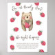 Gender neutral baby shower invitations. Featuring the saying 'WE CAN BEARLY WAIT!', an illustration of a watercolor bear with raspberry in paws, and many red berries. Matching items available.