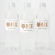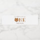 Our little bear is turning one first baby birthday water bottle labels. The labels are white and brown with the word "One" in large letters with a bear face illustration as the first letter of the word. Simply customize these labels, add them to your cart, and happy birthday to your wonderful baby!