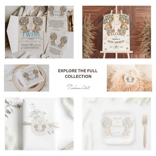 Teddy Bear themed Twin boys Baby Shower thank you stickers, featuring the sweetest bears soaring high with cute hot air balloons! This design is perfect for celebrating the arrival of twin boys. Cute teddy bears with blue bows are holding blue and beige balloons. 💙 💙 Don't forget to explore the full collection!