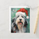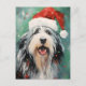 Colourful and joyful Christmas design with a Bearded Collie wearing a Santa hat.