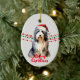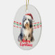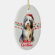 A grey Bearded Collie wears a red and white Santa Claus hat in front of strings of red and green Christmas beads on both sides of this Holiday ornament. On each side is a field for your own custom text.