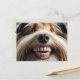 A close-up of a fluffy Bearded Collie dog with long fur humorously shows it grinning with human-like teeth.